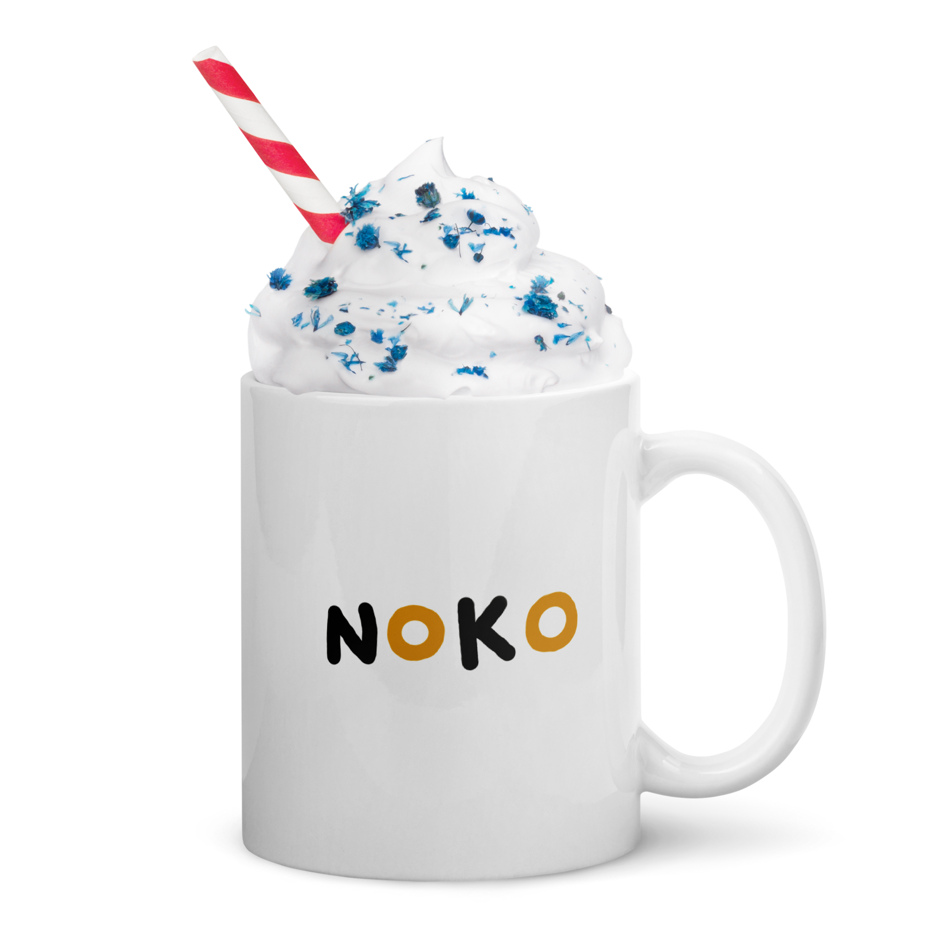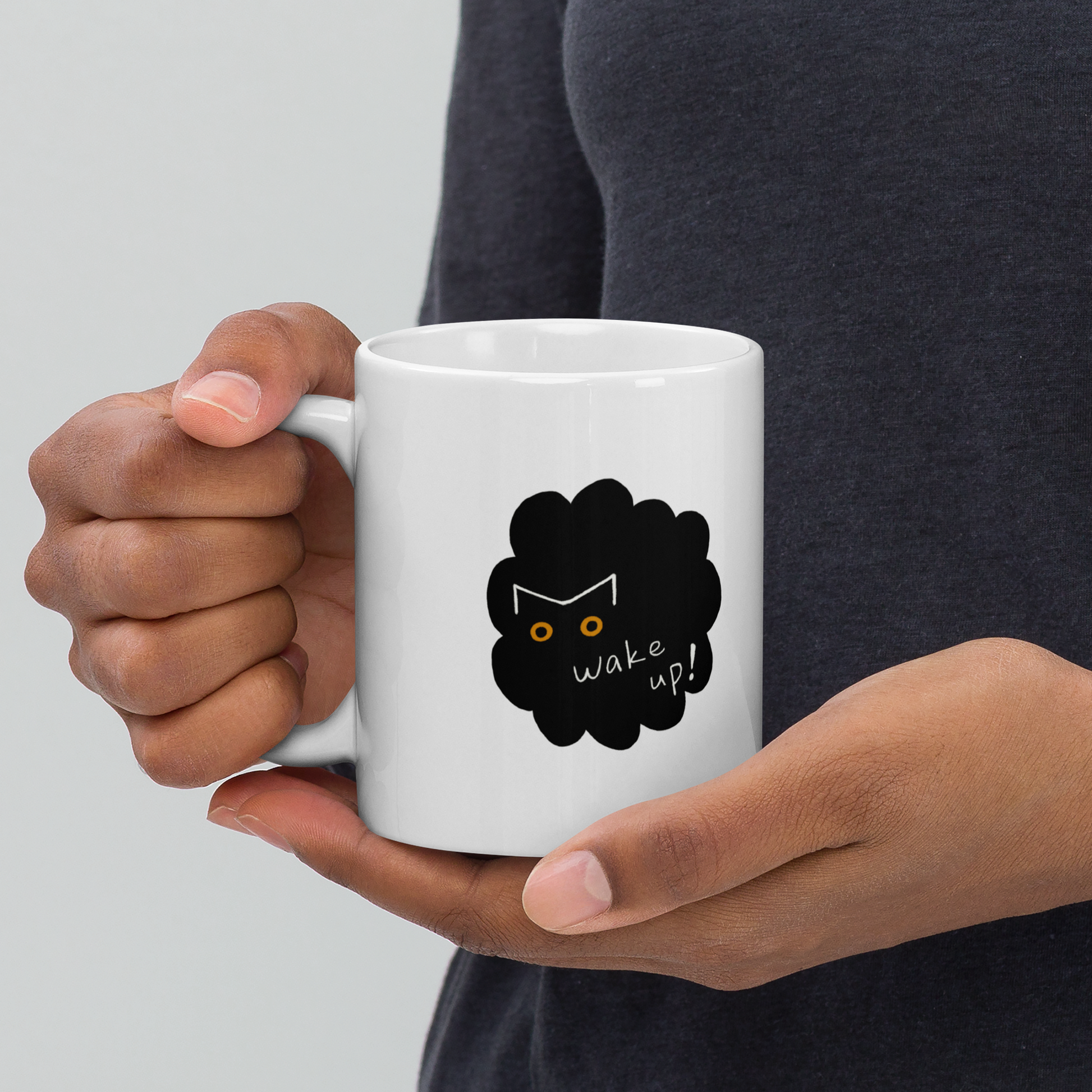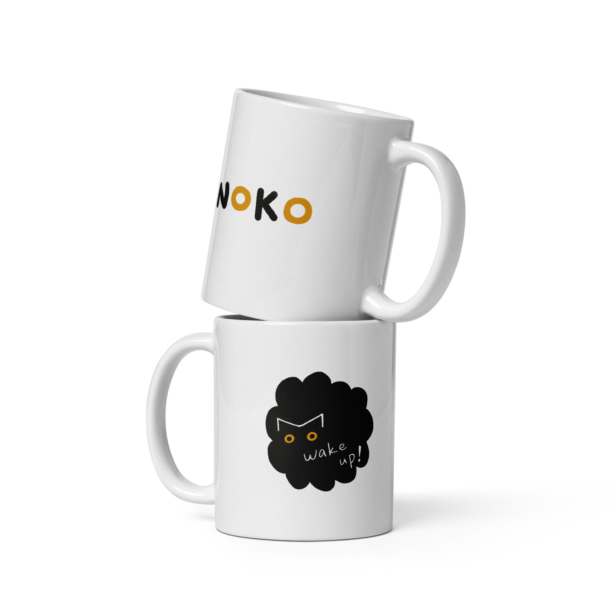 Noko says, "Wake Up! with this ceramic mug as your morning companion purrfect for coffee, tea or Noko's favorite- hot chocolate with whipped cream